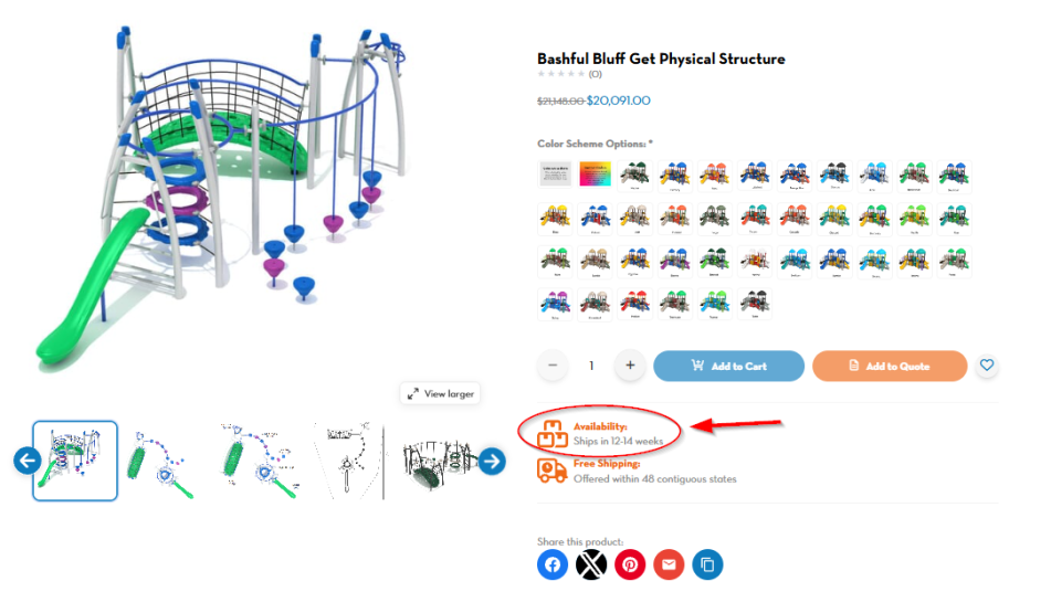 Many of our items can be customized. Please understand if you choose to customize your park or playground equipment, this could cause additional manufacturing time, and will push the product delivery back.