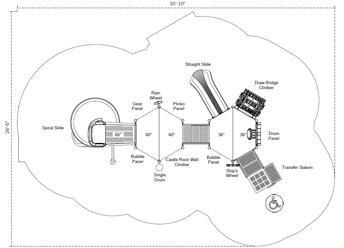 After ascending either the Draw Bridge Climber or the Castle Rock Wall Climber, children will find a host of play elements to choose from. The Plinko Panel and Gear Panel each give kids a chance to test their hand-eye coordination, while the Drum Panel allows kids to collaborate with Single Drum players and create a percussive rhapsody. Lastly, playground-goers will have the choice between descending the Spiral Slide or the Straight Slide, and once they get to the ground, their playground journey will begin anew.
