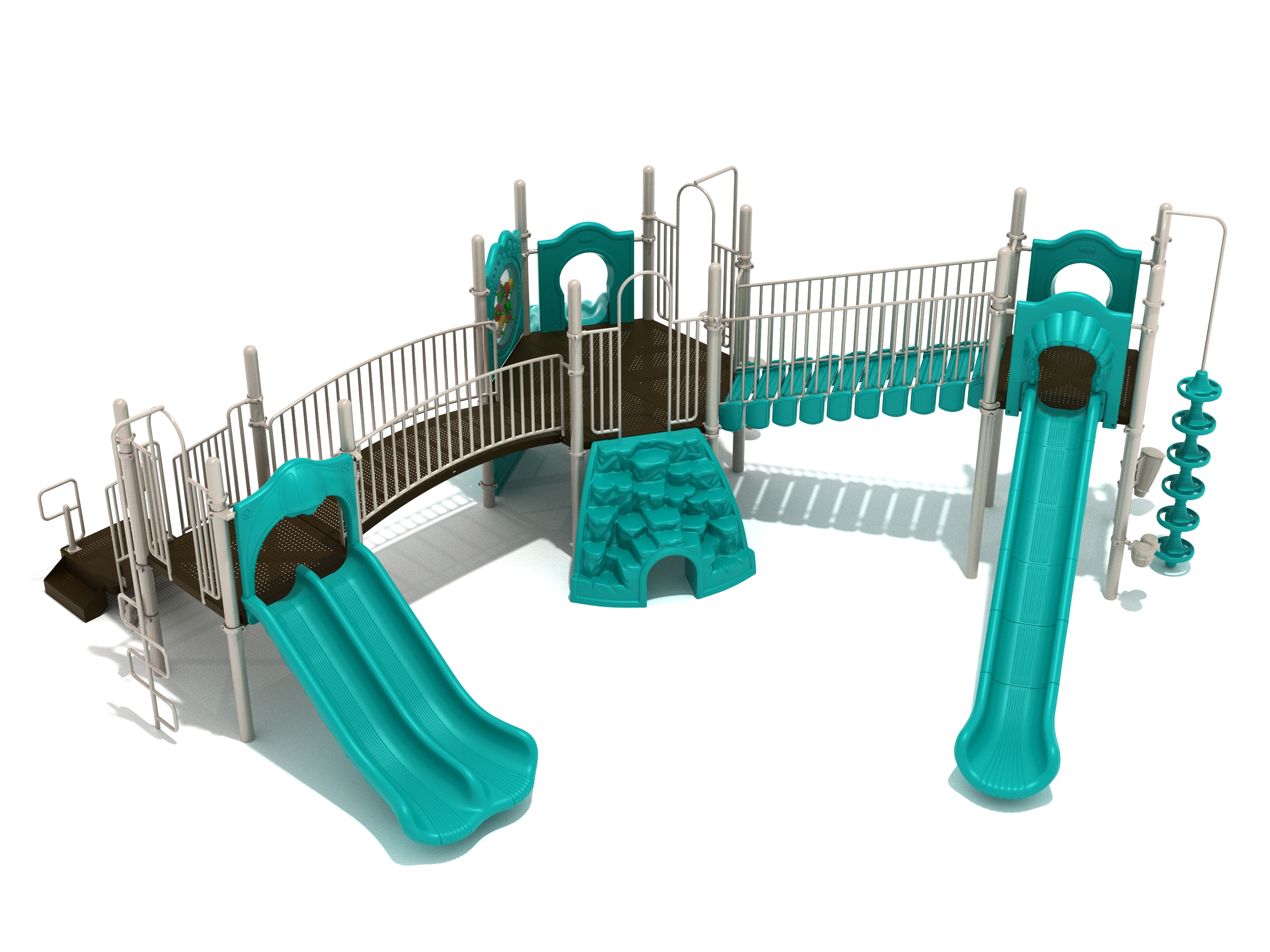 Enter a fortress of activity and imagination with the McKinley Max Playground Structure. Featuring many distinct playtime events, like an Arch Bridge and a Snake Climber, the McKinley invites children to pretend to be Queens and Kings of the castle, vanquishing dragons and scaling the heights. A hexagonal platform at the center features a Rock Hole Climber and Pea Pod Climber, Gear Panel with moving shapes and levers, and a Wave Slide for a gentle yet bumpy ride. Kids can cross the incline Bones Bridge up to a deck equipped with both a Wave Slide and Straight Slide for a fun way off of the structure.