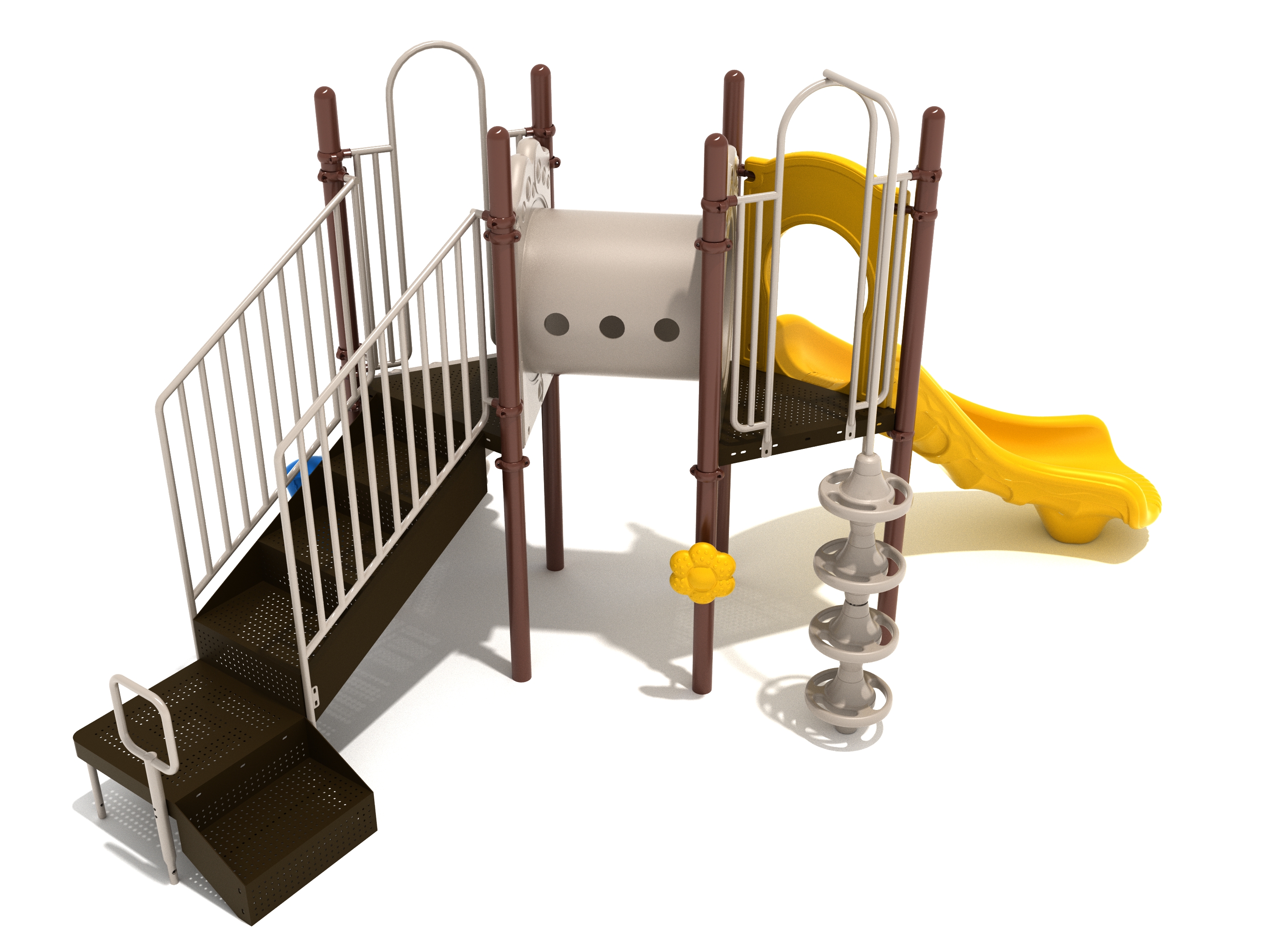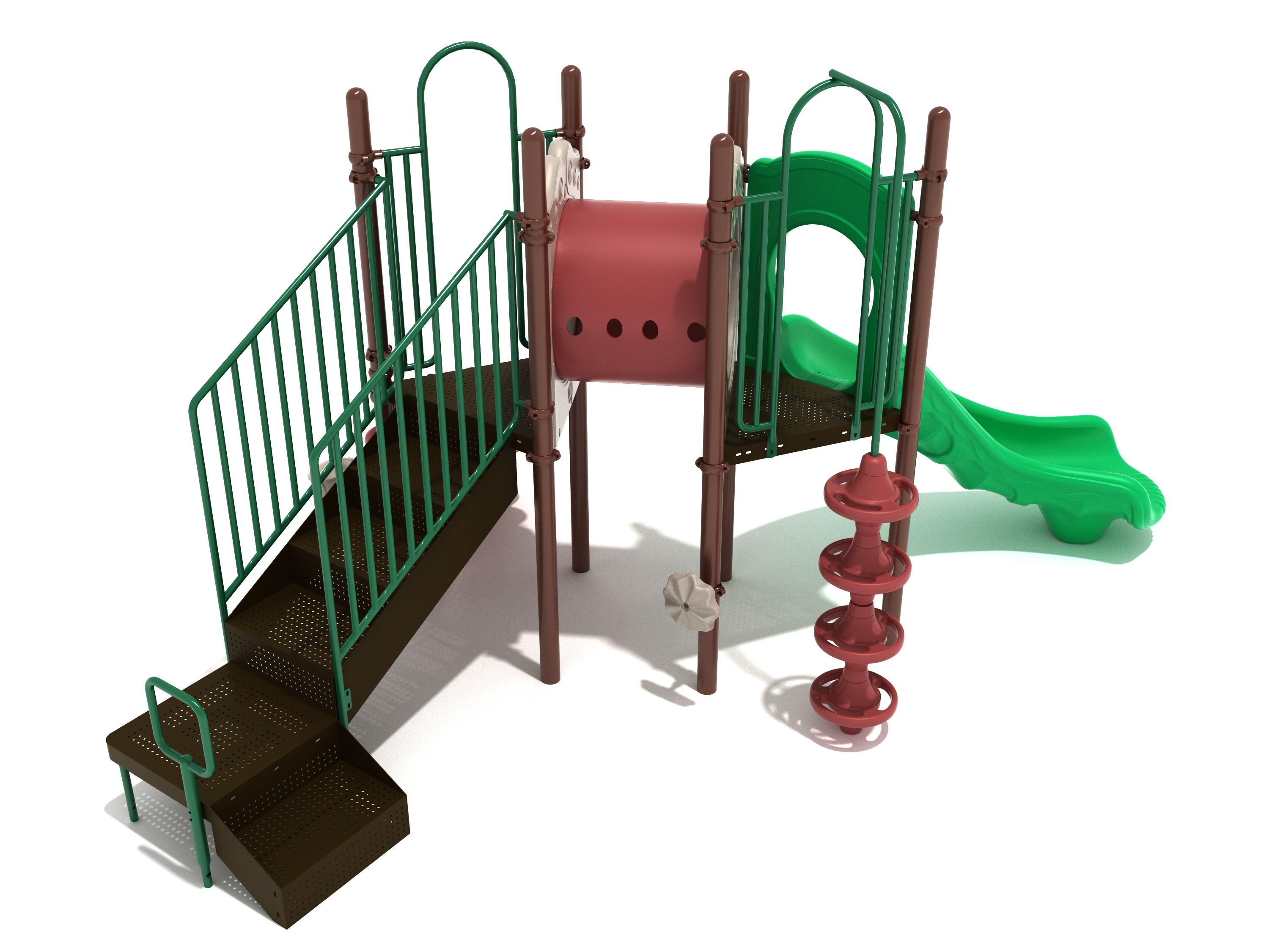 Explore a jungle of fun with the Redmond Spark Playground Structure. This lovely structure features a natural palette reminiscent of the Pacific Northwest and is composed of two triangular, elevated platforms connected by a delightful, easy-crawl Tube Bridge. A Number Climber, Pod Climber, or stairs give children access to the structure. And a Right-Turn Slide offers a chance to zip down to the ground level, where kids of all ages and ability levels can engage in active and creative play via Rain Wheel and Single Drum.